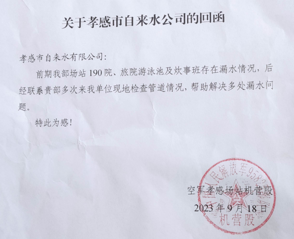 除此之外,再與工作人員的溝通中我們得知,該院內新建的一處游泳池一直無法通水,秉持著讓用戶滿意的服務理念,我公司技術人員馬不停蹄義務幫助其查明原因,恢復正常通水,解決了用戶的各種用水問題。事后,為了感謝我公司高效率高質量的為民服務,空軍孝感廠站機營股工作人員特意送來了感謝信。