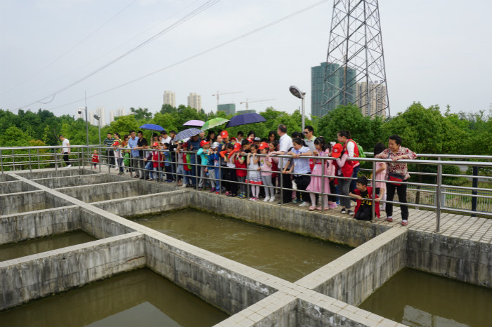 小記者們都是第一次走進水廠,對每道生產(chǎn)流程都非常好奇,對每件處理設施都饒有興趣,一路走一路七嘴八舌地詢問;三水廠工作人員則結合水處理流程和工作原理,用淺顯而生動的語言為他們一一講解說明,耐心細致地解答著每一個提問。在反應沉淀池上,小記者們看到了渾濁的源水由兩根巨大輸水管道輸送到絮凝反應池里,當他們得知這里的源水都是來自34公里以外的漢江時,不由得咋舌驚嘆“原來我們每天喝的自來水需要輸送那么遠的距離啊,真是太不容易了!”