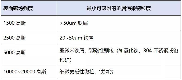 如上的磁場強度是指在此強度下,此類金屬污染物直接貼近時可以吸附情況,若是物料與磁棒有一定的間距(如超過1cm),則需要更高的磁場強度。