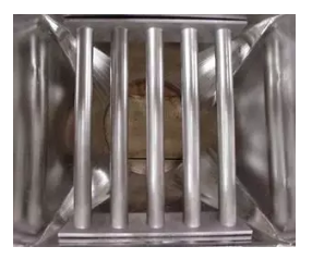 強磁棒上一旦吸附上磁性或弱磁性物質,通常是比較難去除了,因此易于清潔的設計是行業的一個良好實踐。易于清潔的設計是在磁棒的外部加一個夾套,抽取磁棒后,夾套上的磁性消失,吸附的異物自動脫落。如下圖所示。